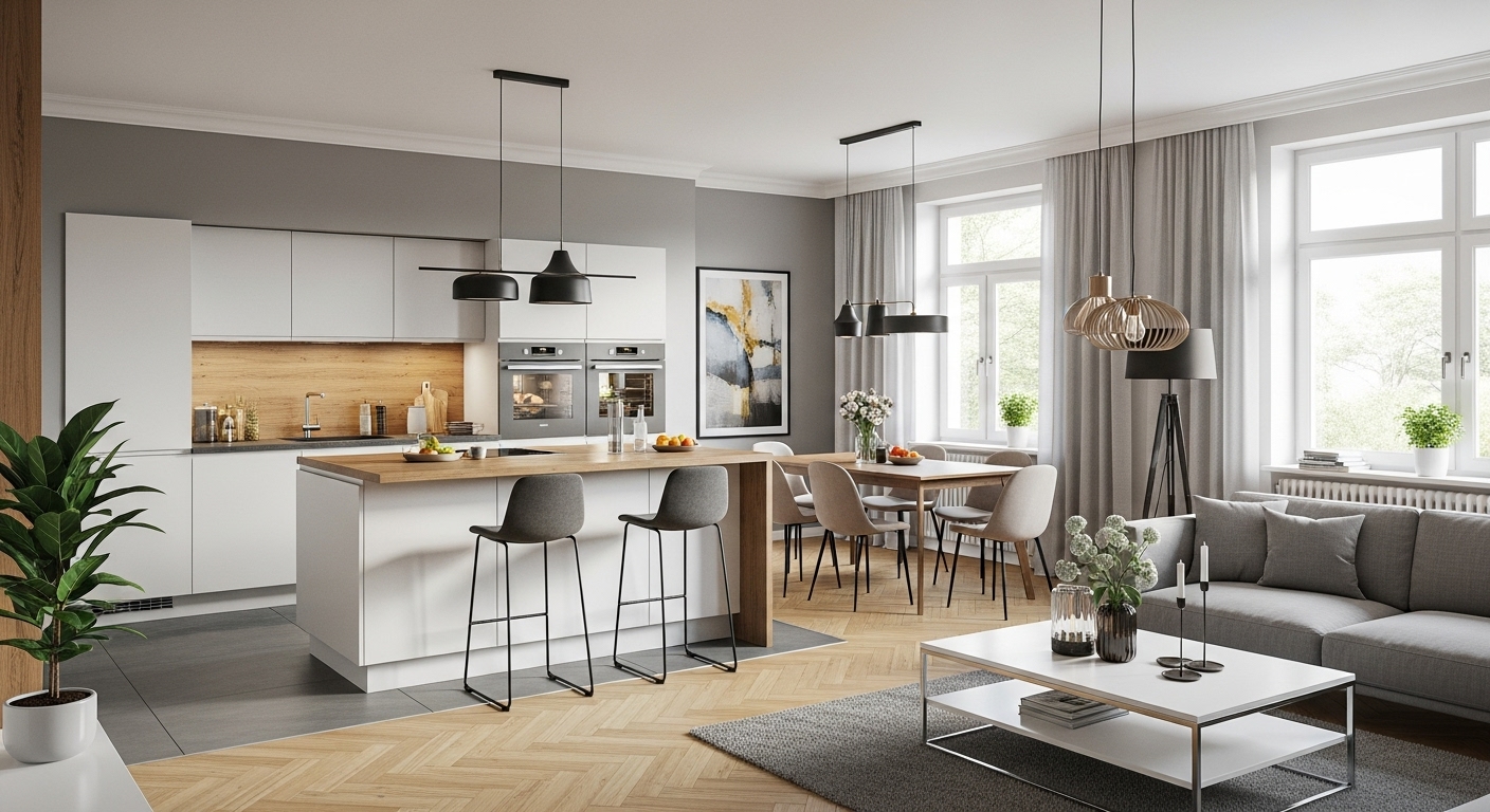 Farben sind ein einfaches, aber wirkungsvolles Mittel, um Räume optisch zu gliedern. Eine kräftige Akzentfarbe in der Küche kann den Arbeitsbereich betonen, während im Wohnzimmer gedeckte Töne Ruhe schaffen. Wichtig ist, dass die Farbpalette harmoniert, damit das Gesamtbild nicht zerstückelt wirkt.
